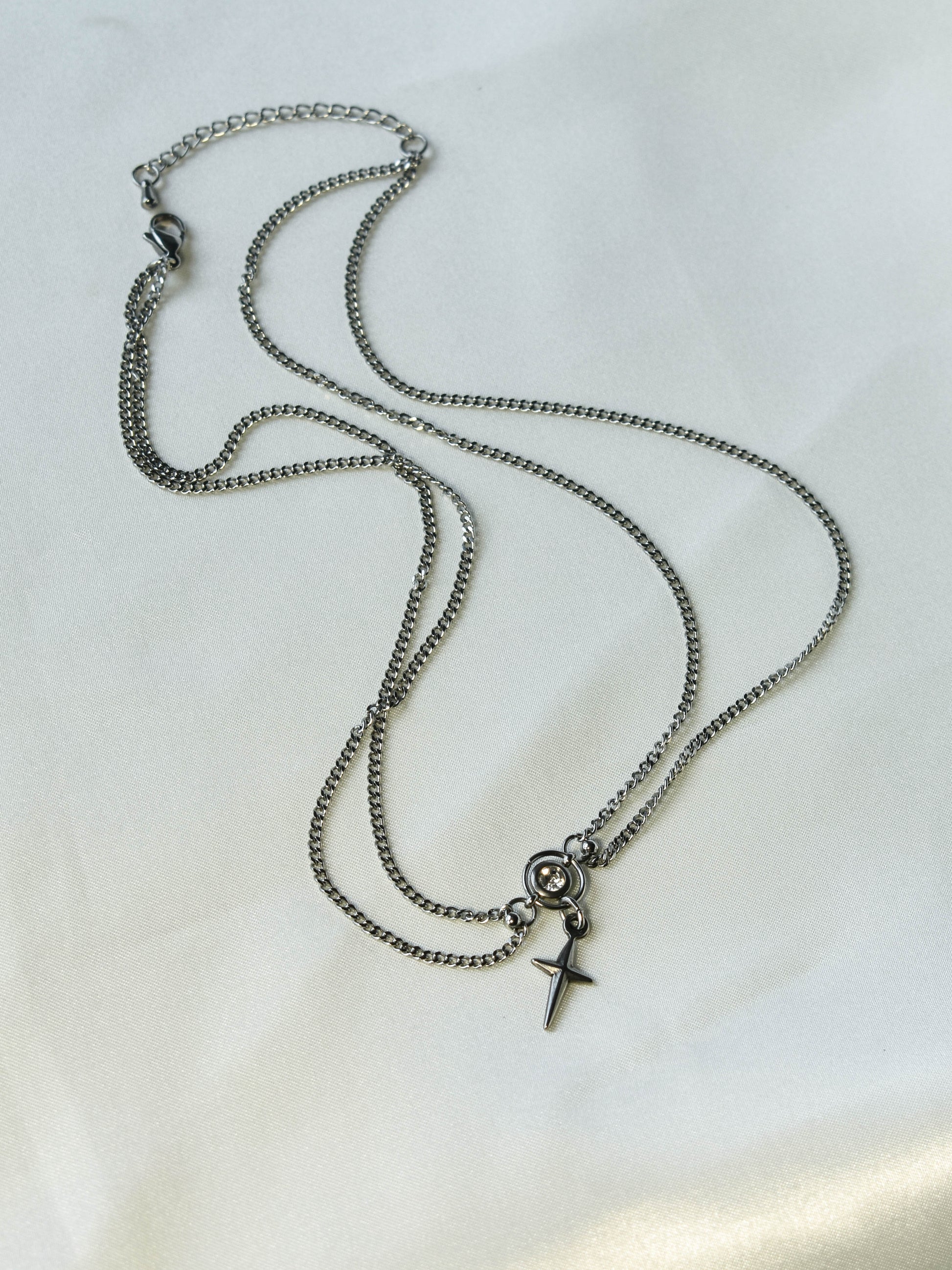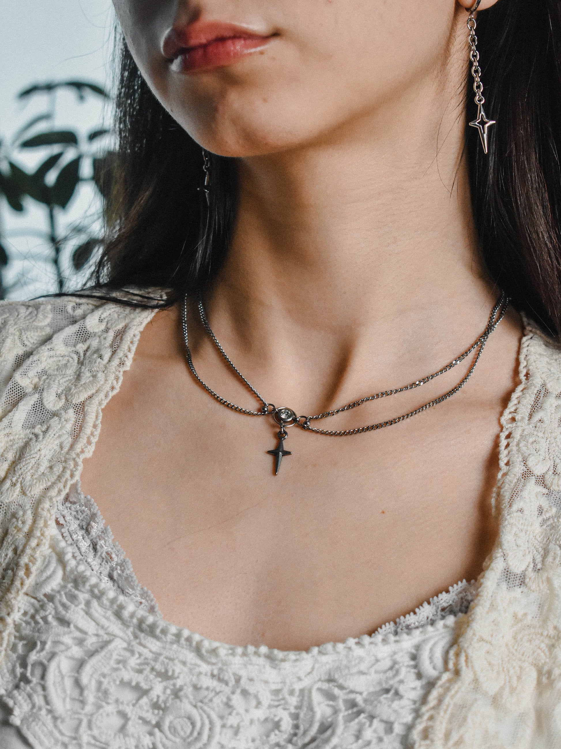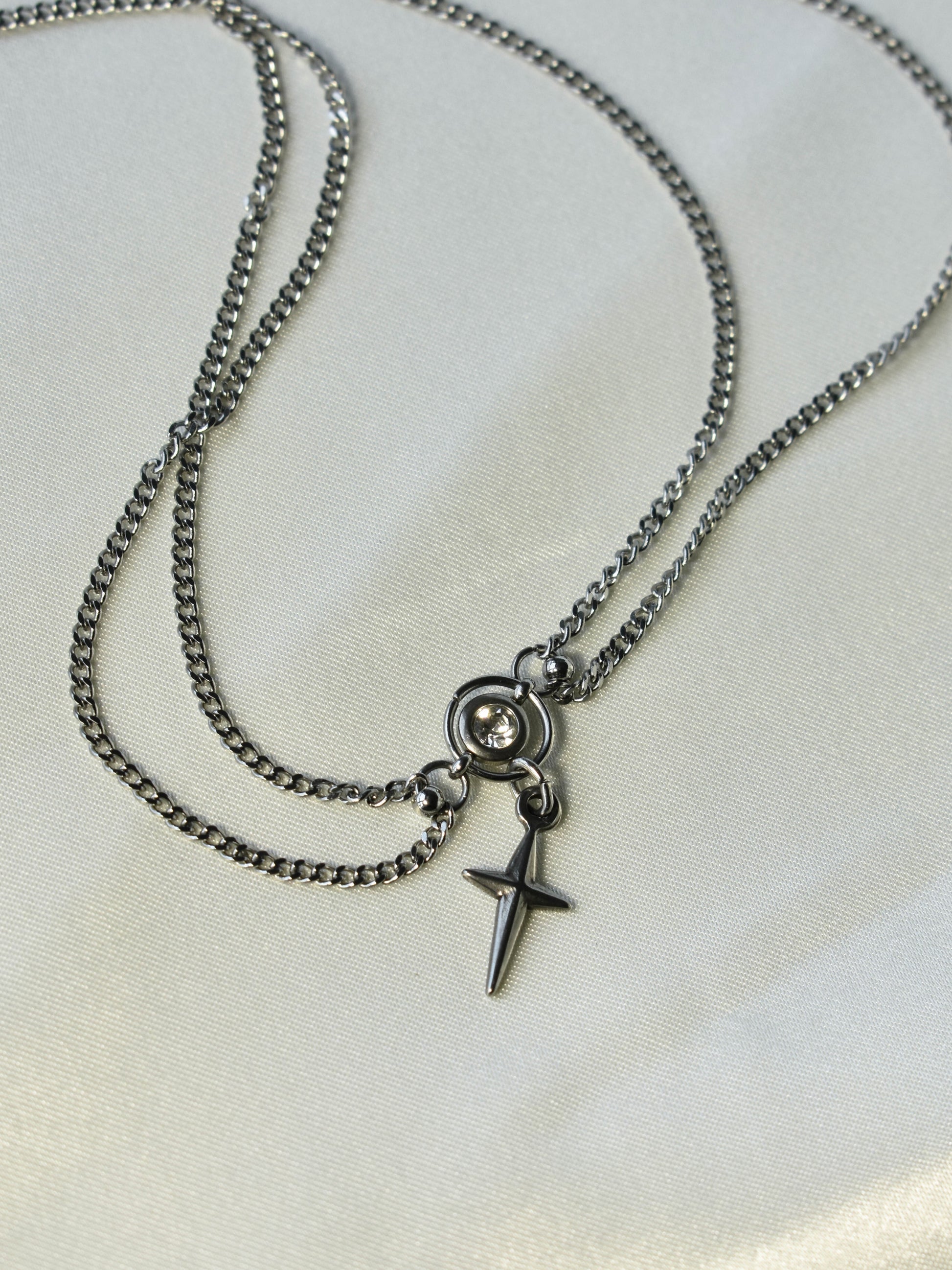 This stunning necklace features layered curb chains and a jewel-like glass rhinestone with a star suspended below in its center. It's unique with an edge yet refined enough to wear with a multitude of looks.
