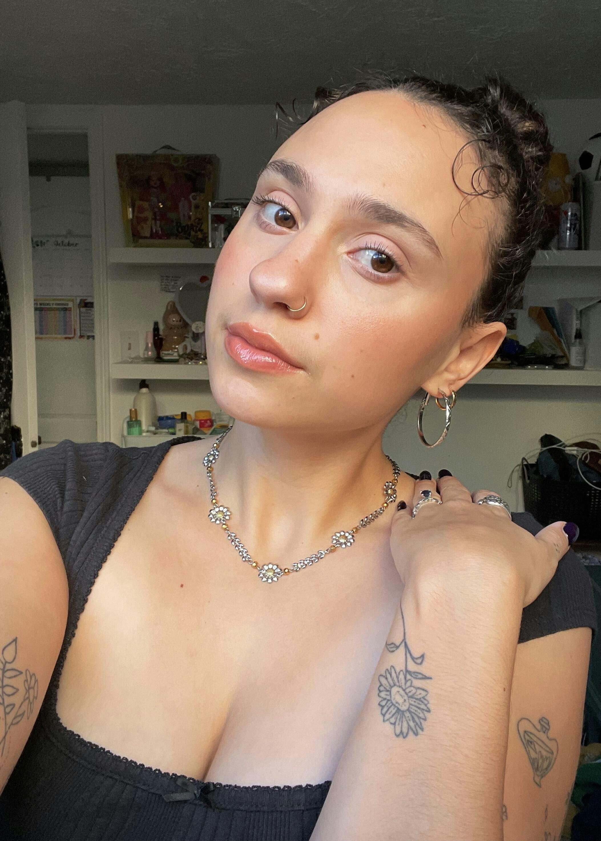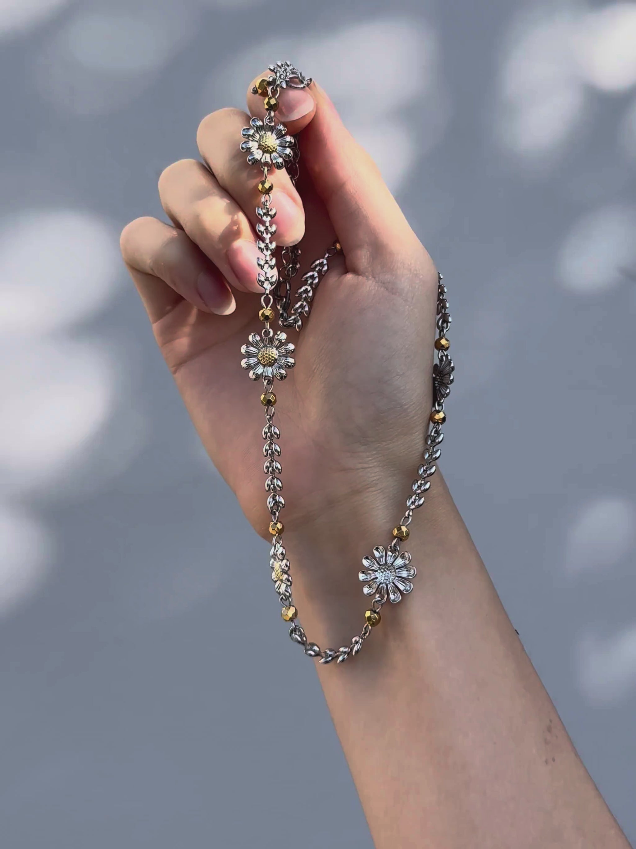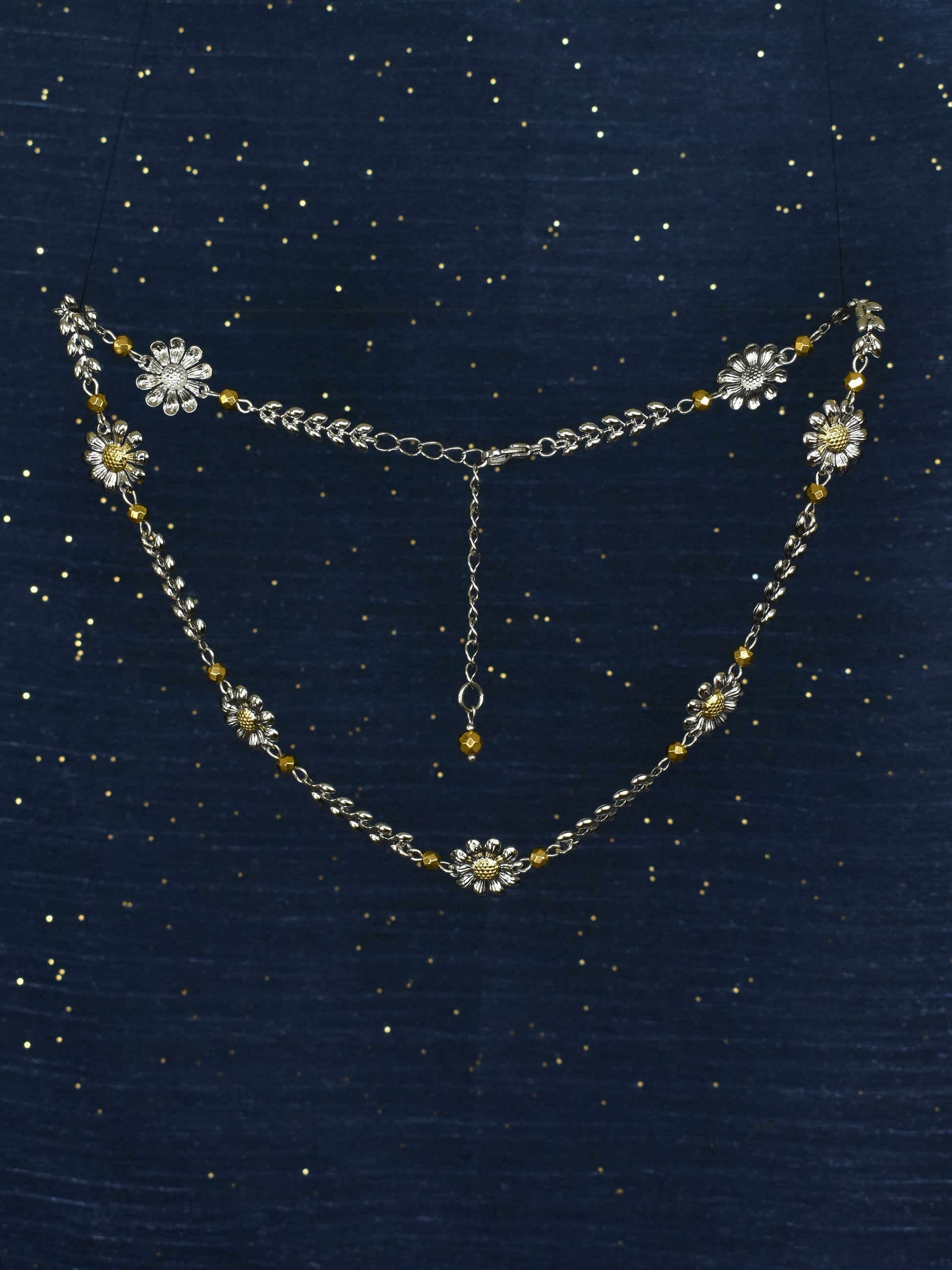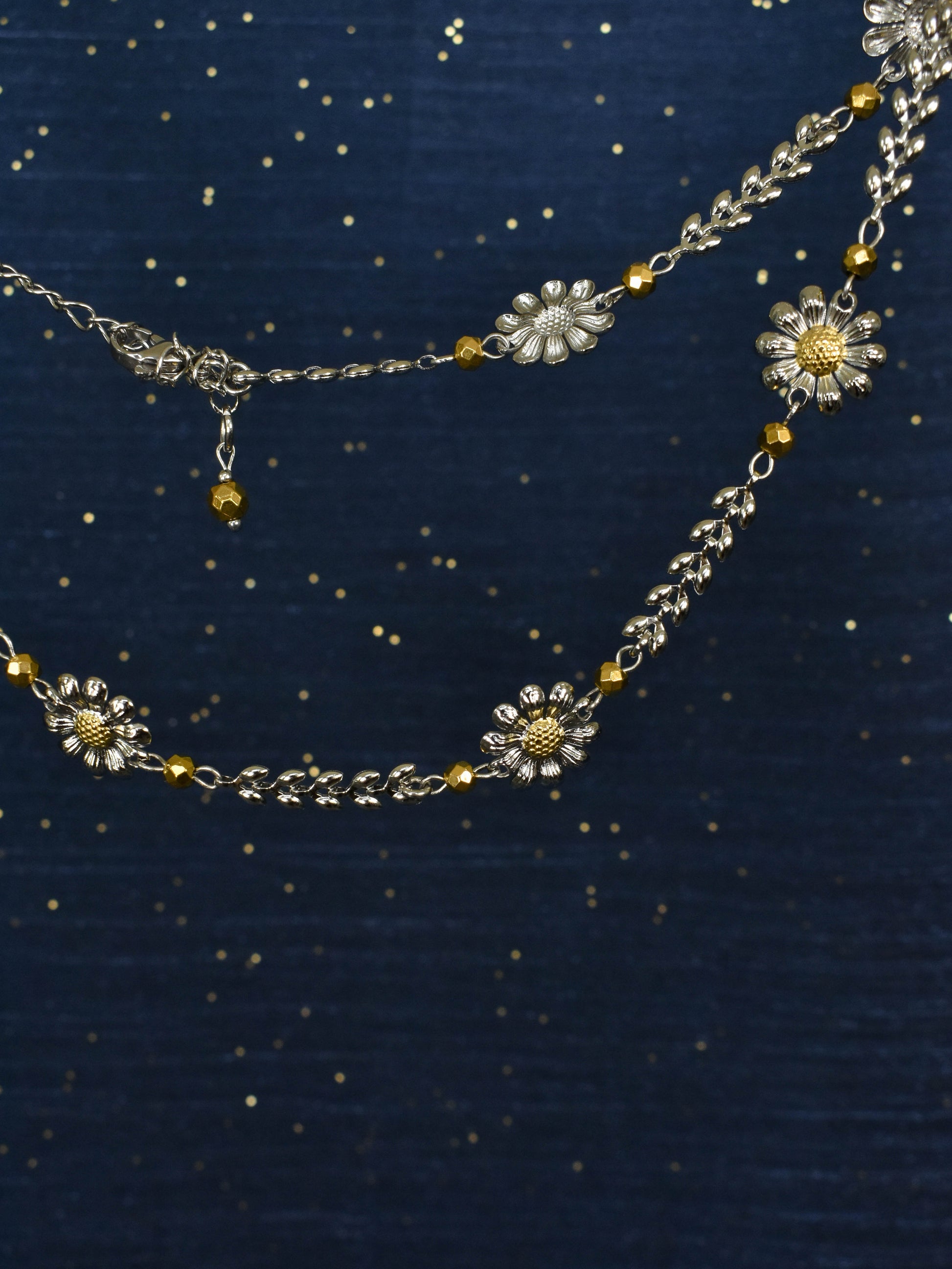 This dreamy necklace features gorgeous silver-gold flower charms and is made to resemble a chain of daisies one would make in a field on a summer day. The Daisy Chain is ethereal, timeless, and a one-of-a-kind piece.