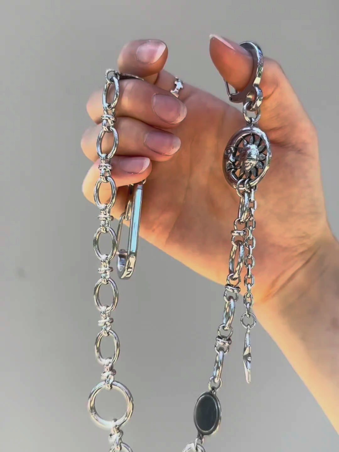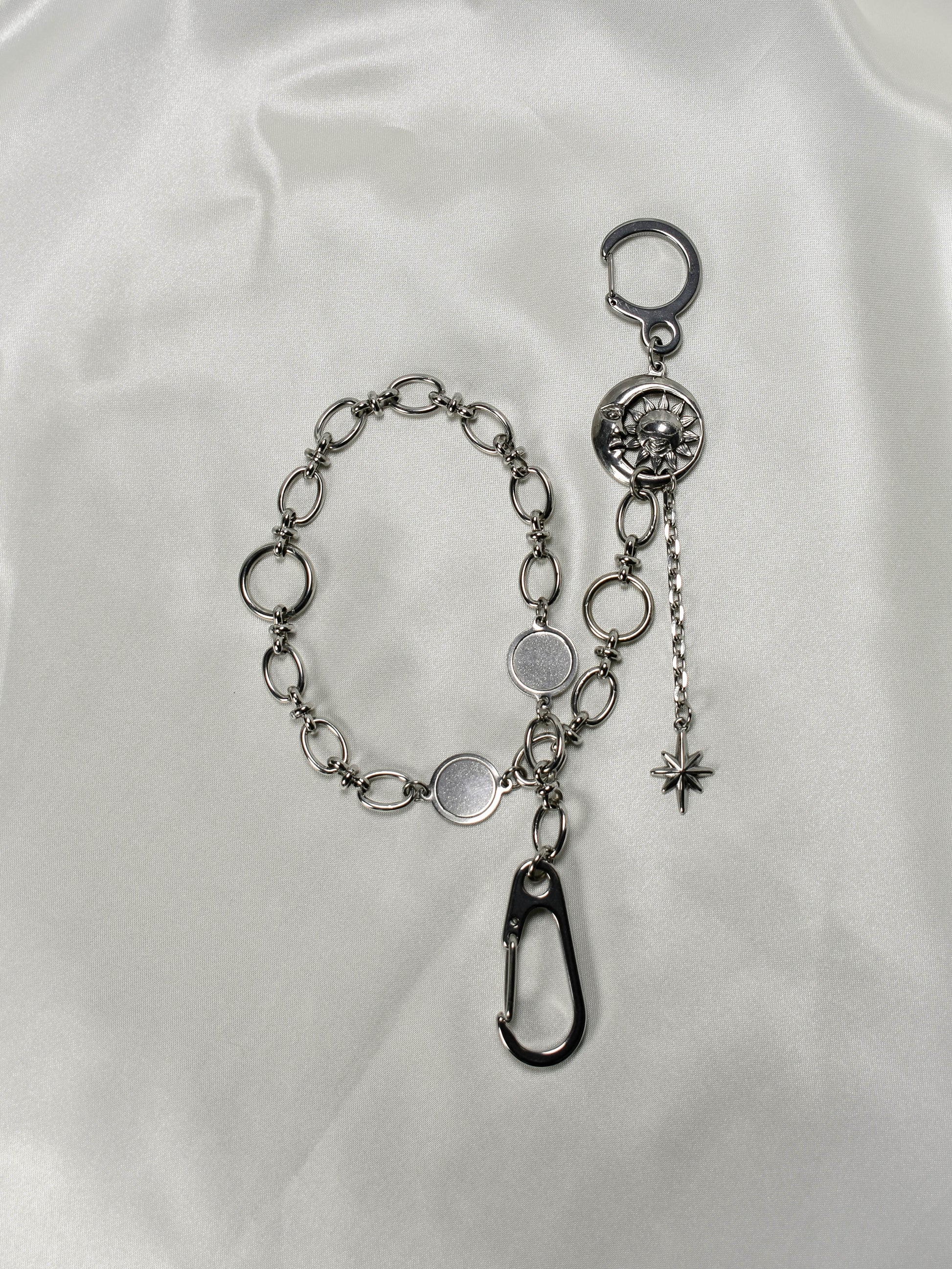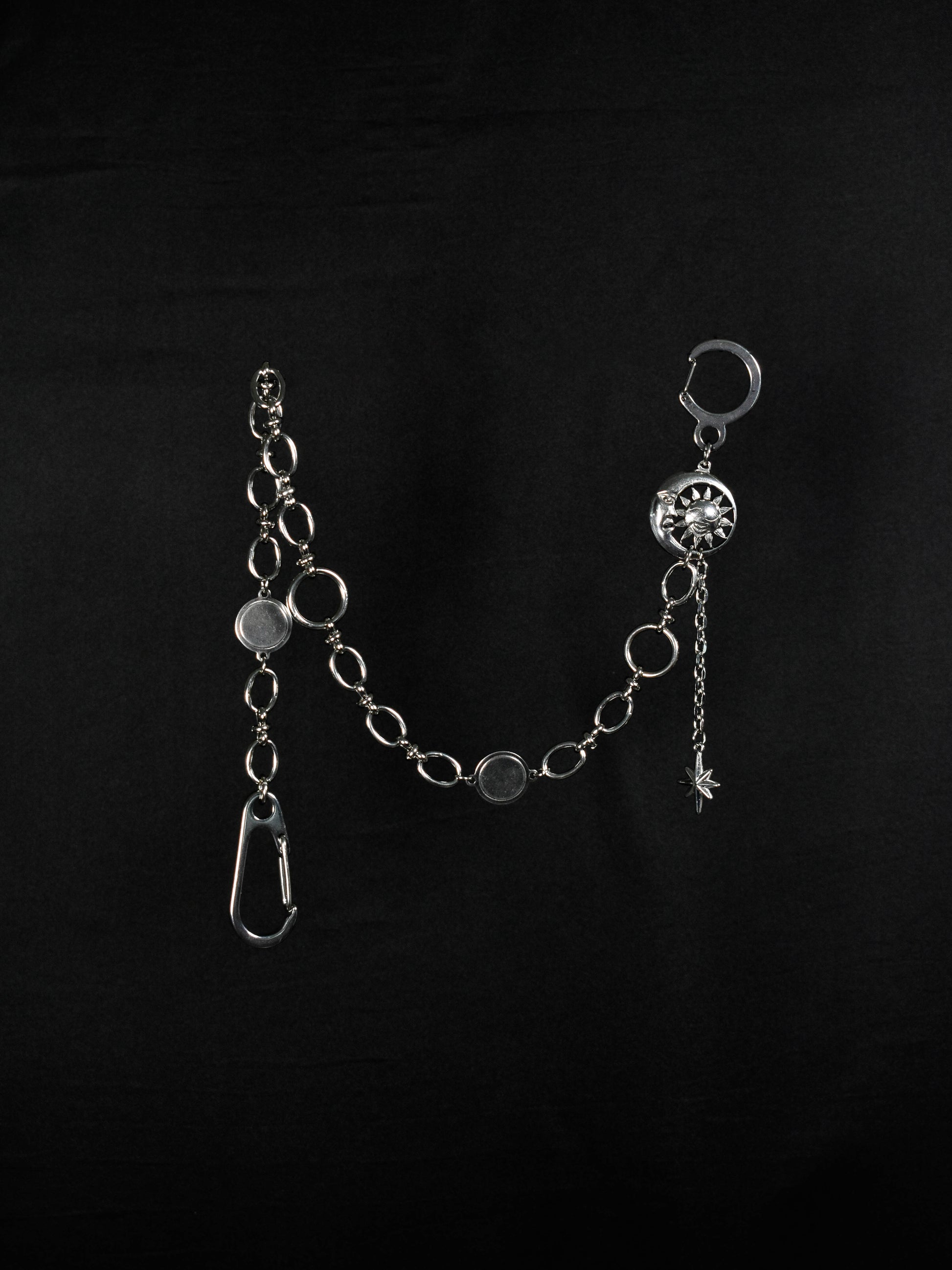 This celestial wallet chain features a stunning charm of a moon engulfing a sun, and a star dripping down below. It’s both grunge and versatile, and is perfect for a multitude of looks.