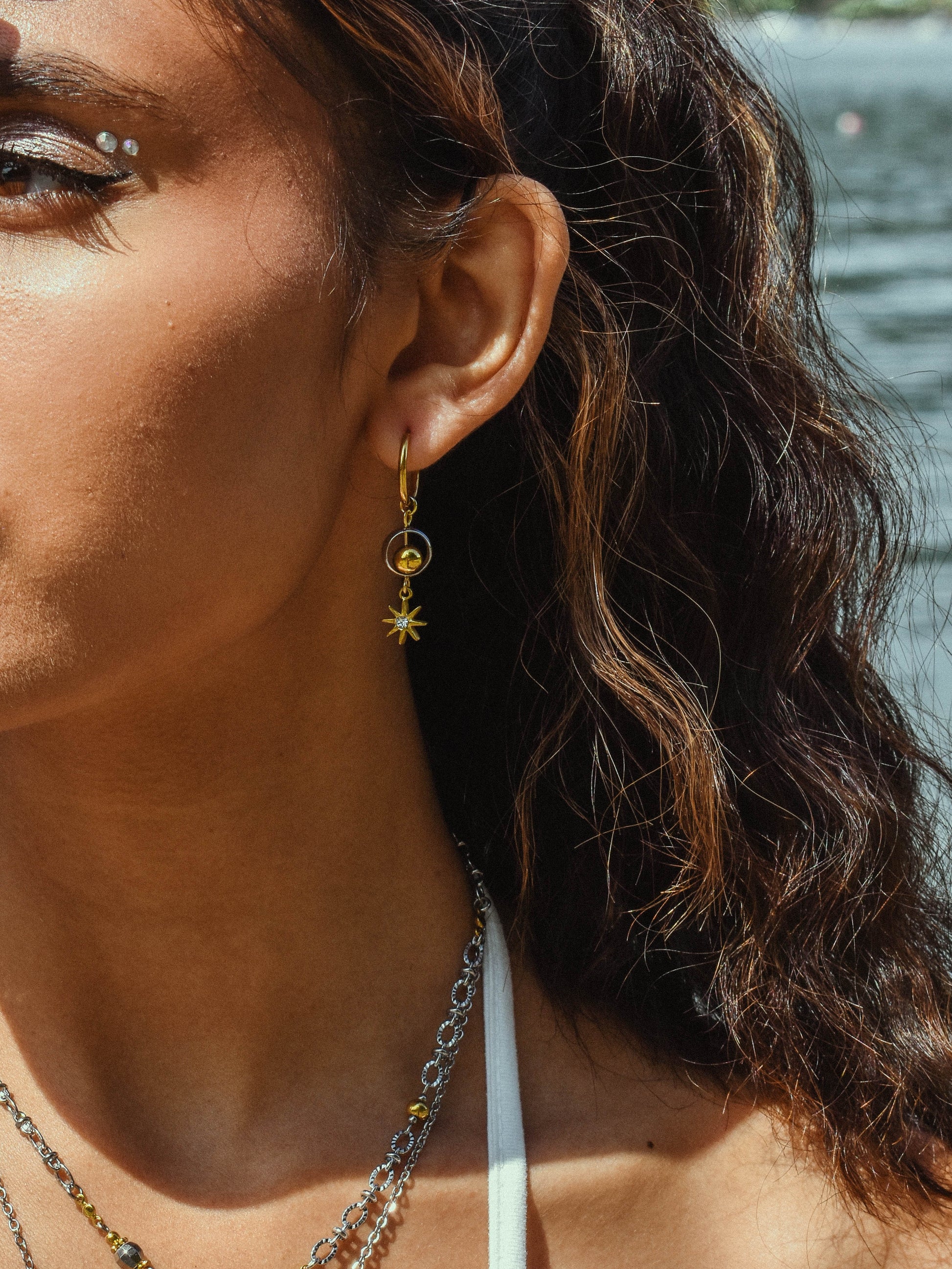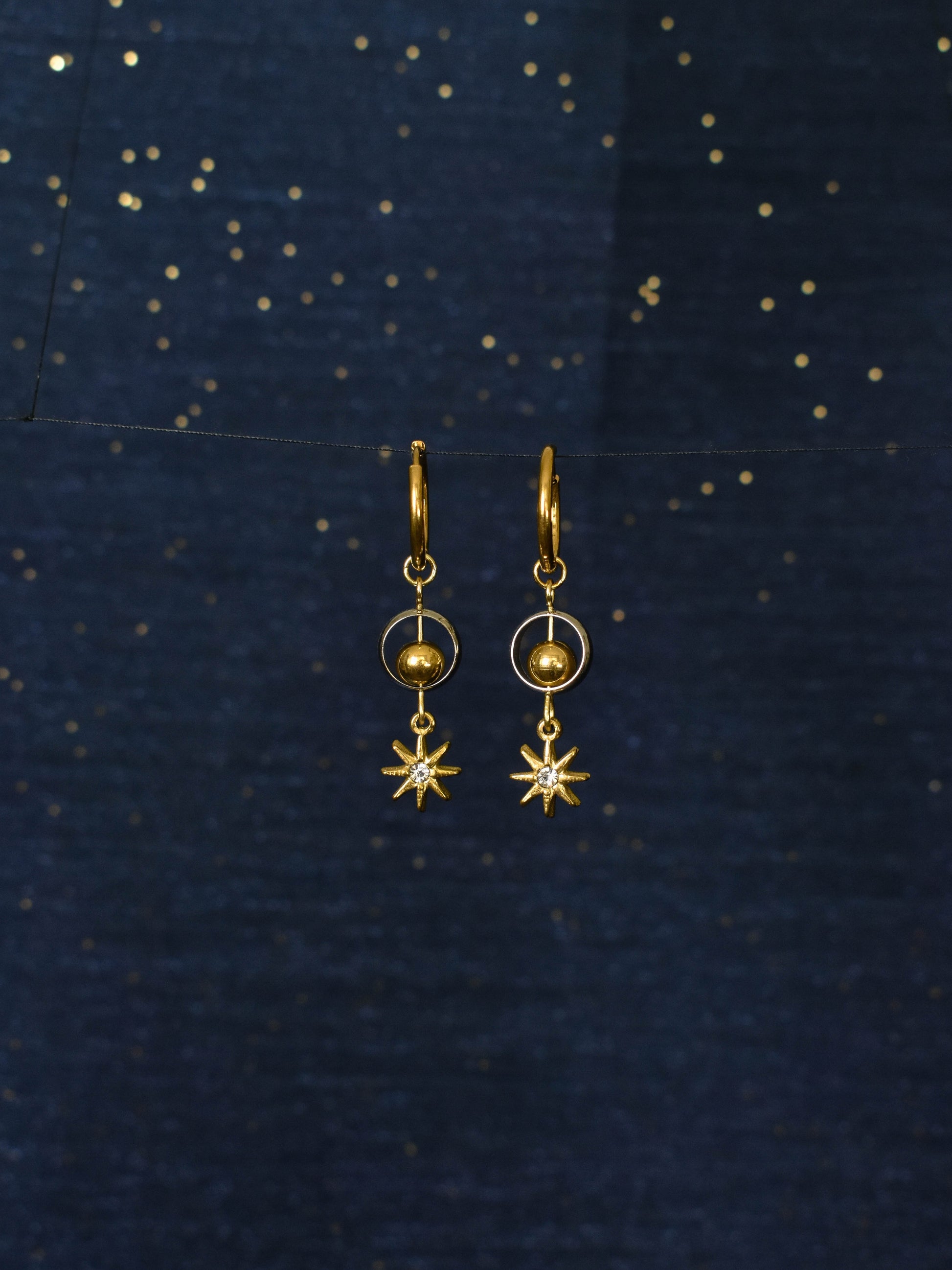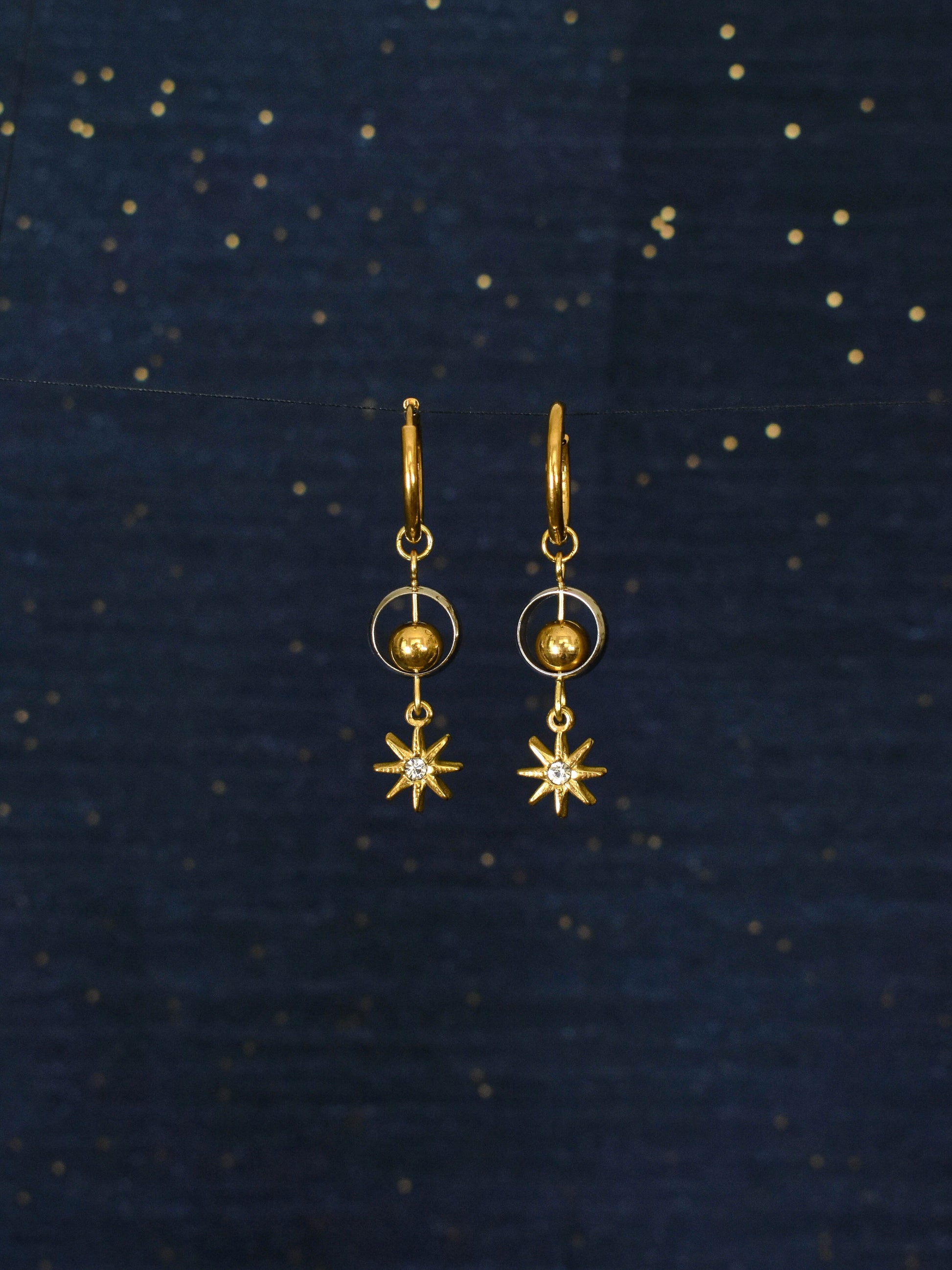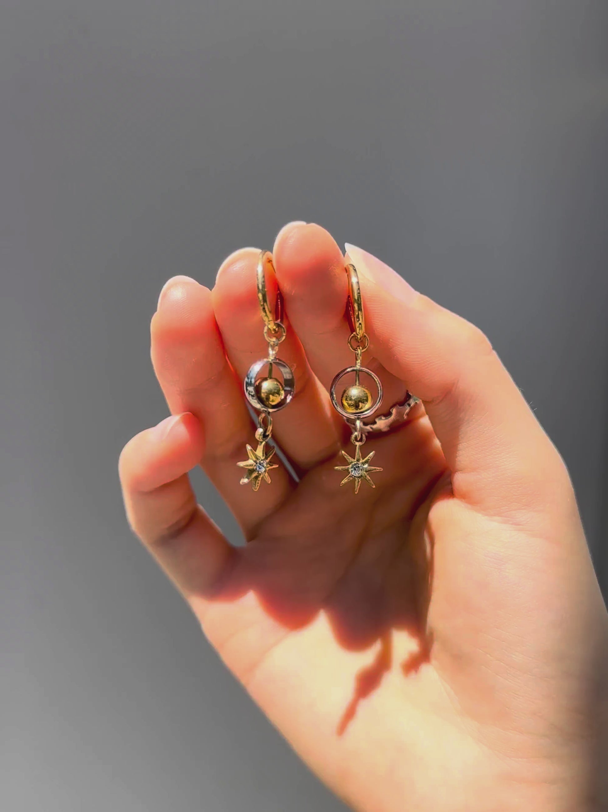 These celestial, gold-silver earrings feature star charms with crystal-like centers, and are the perfect addition to a variety of looks.