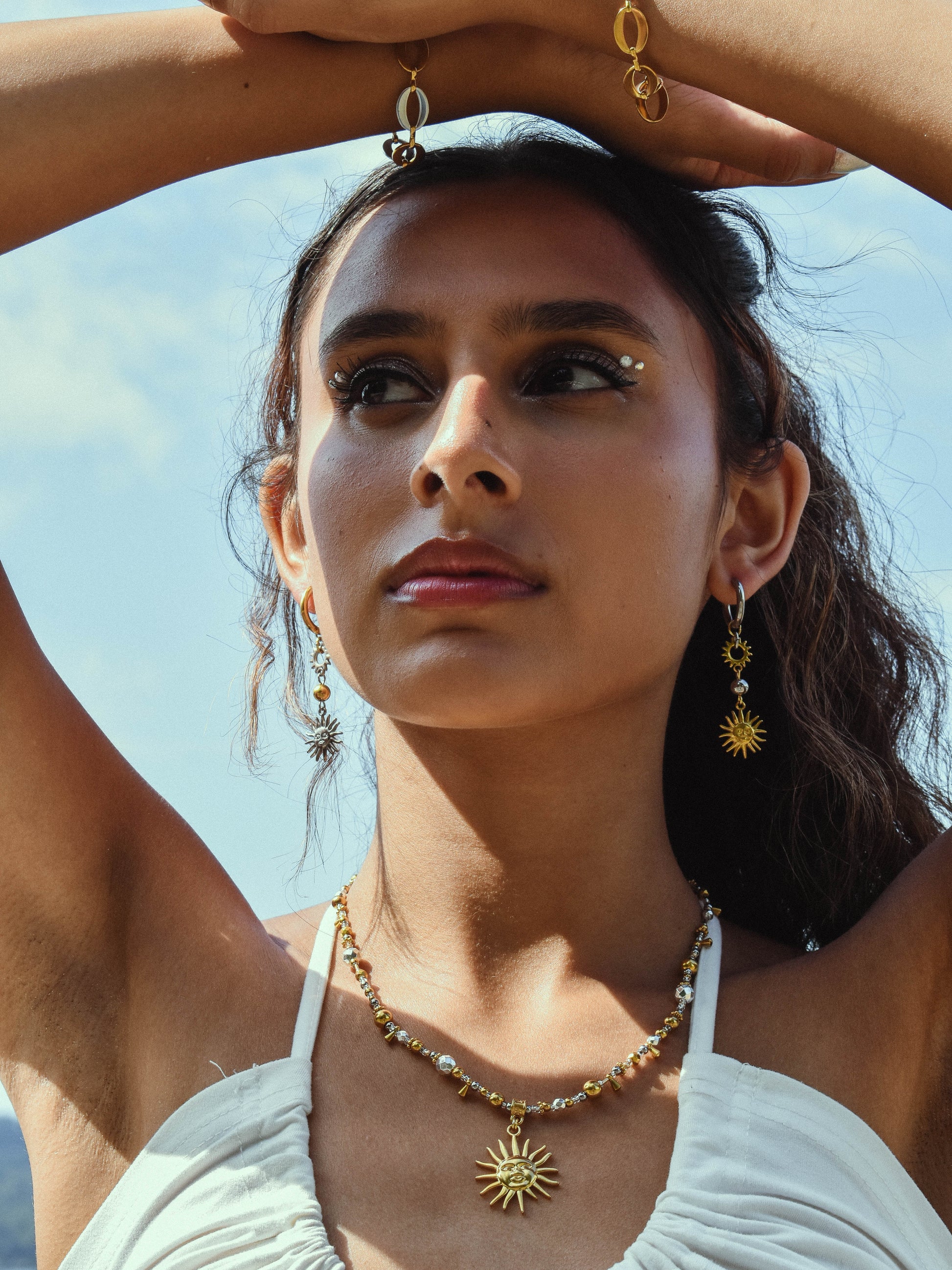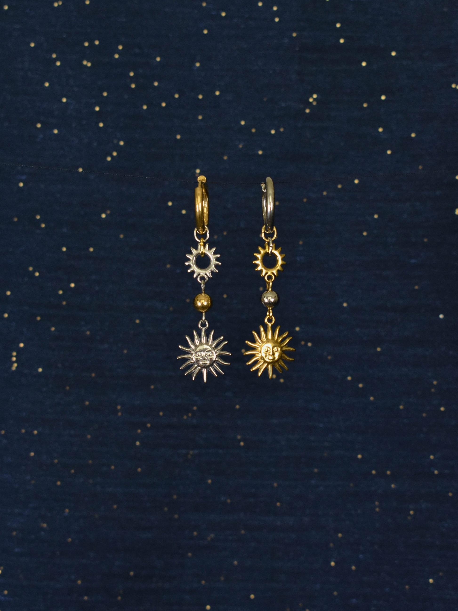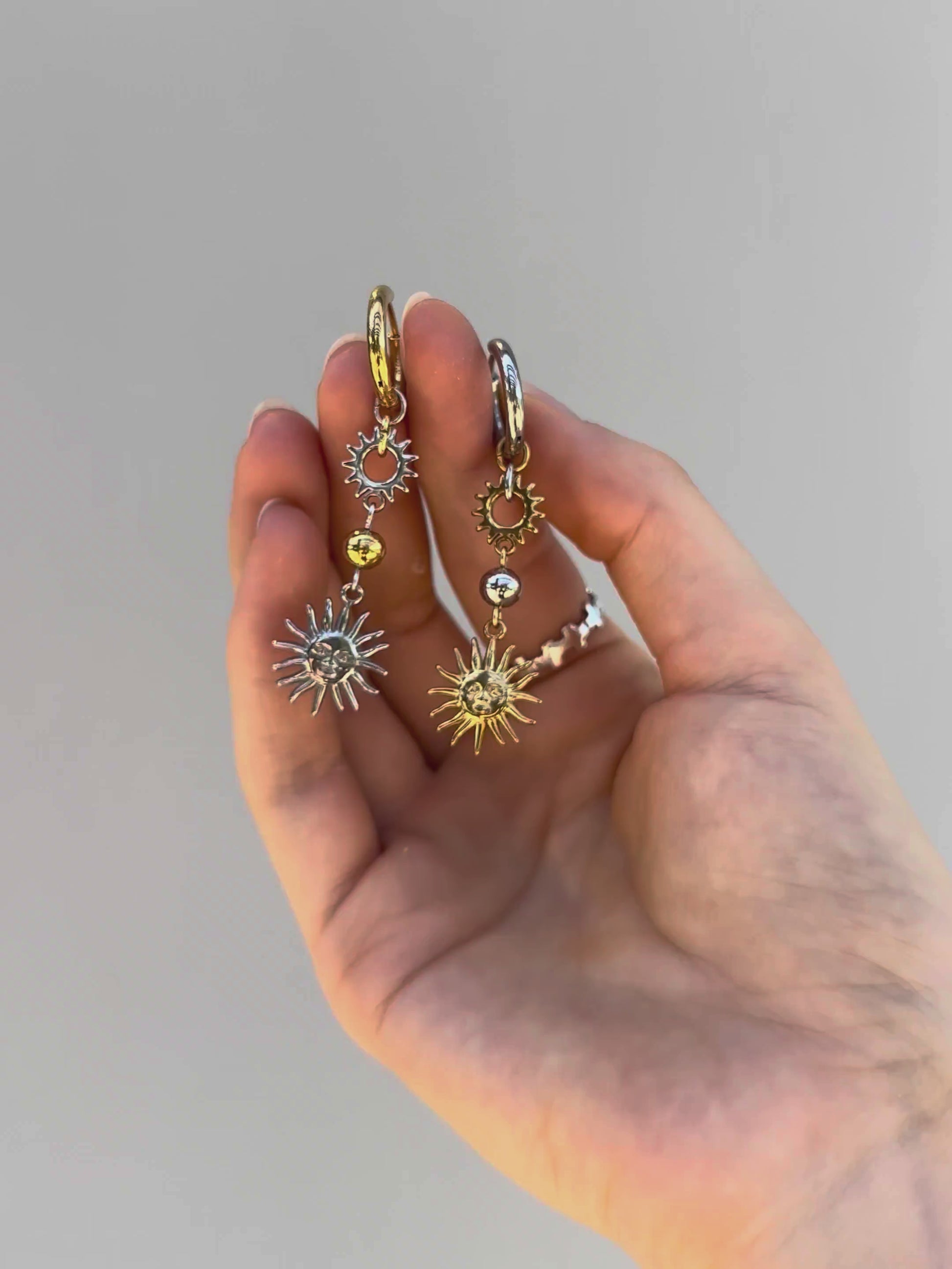 This mismatched pair features the prettiest sun charms in both silver and gold. They're dreamy, unique, and brighten any outfit. Complete the look with the Helios Necklace. ✴︎