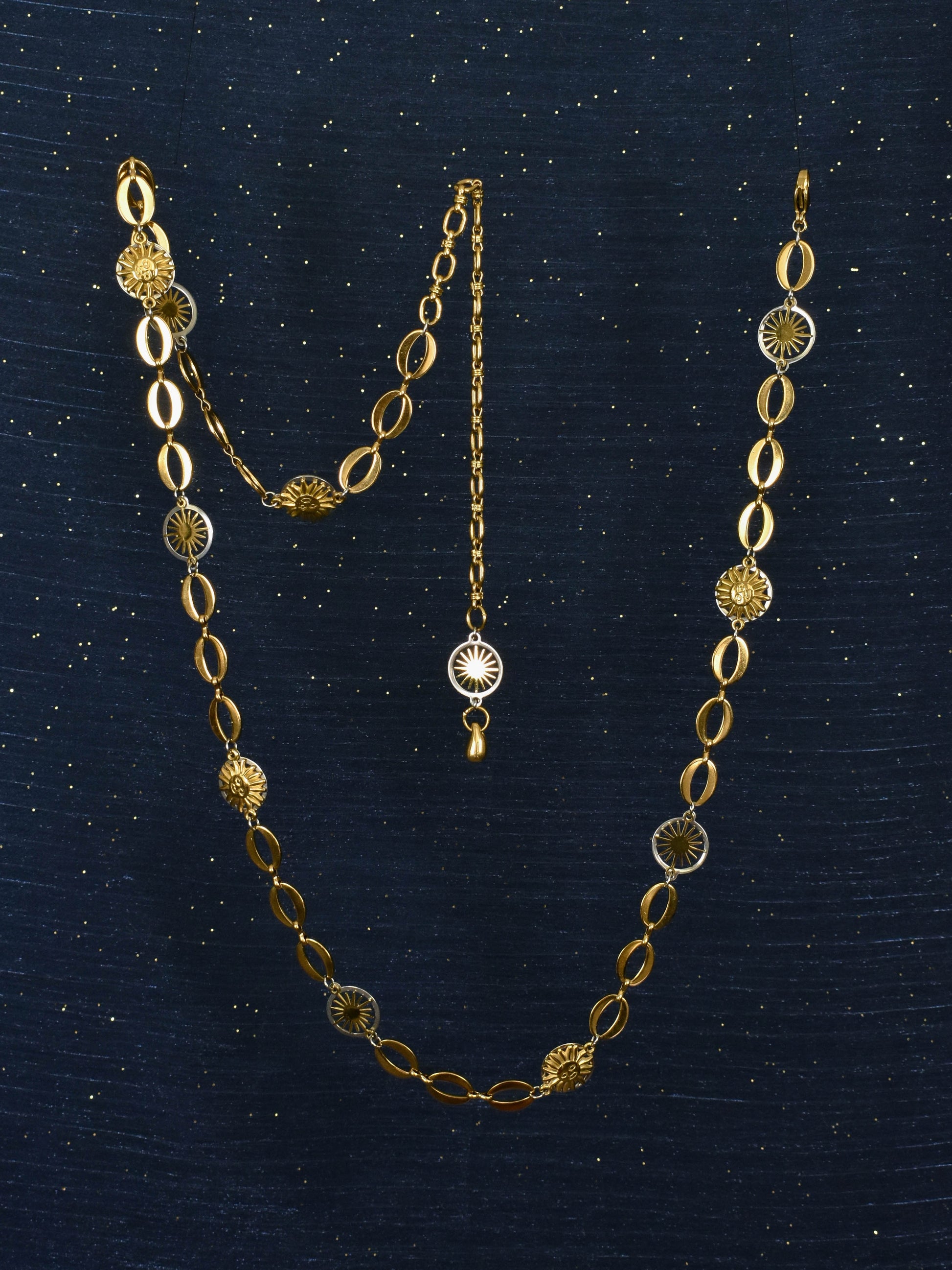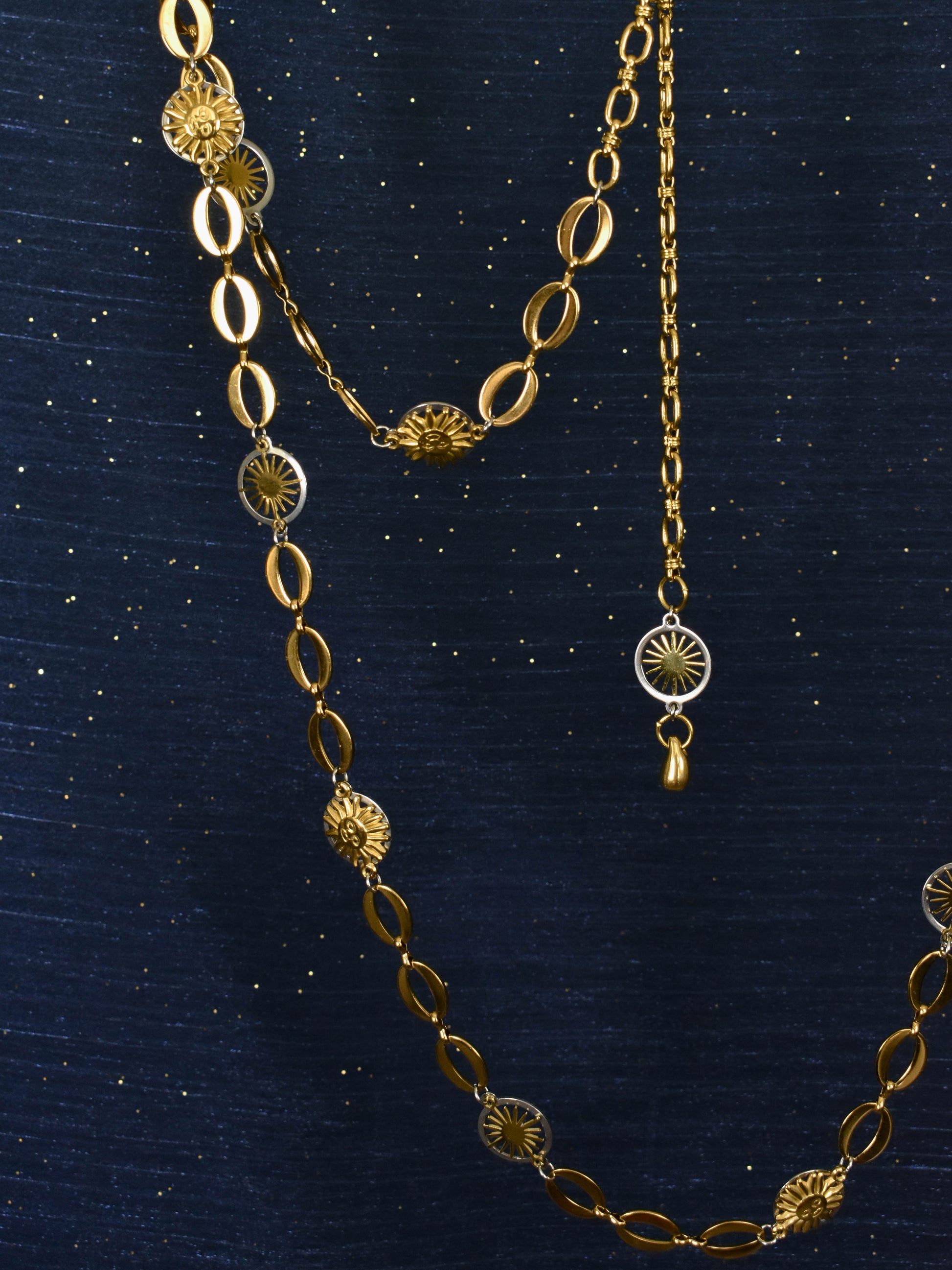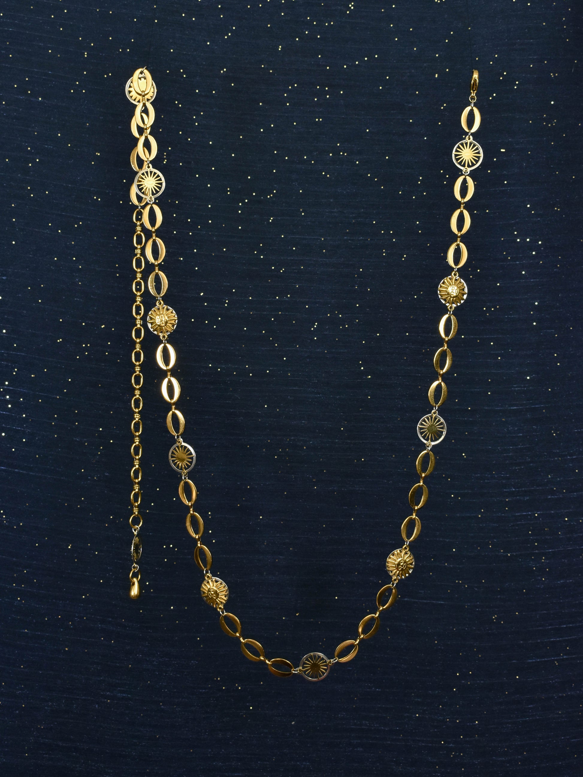 This stunning waist chain features golden sun charms adorning an oval-like chain. It's striking, unique, and will definitely brighten any outfit.