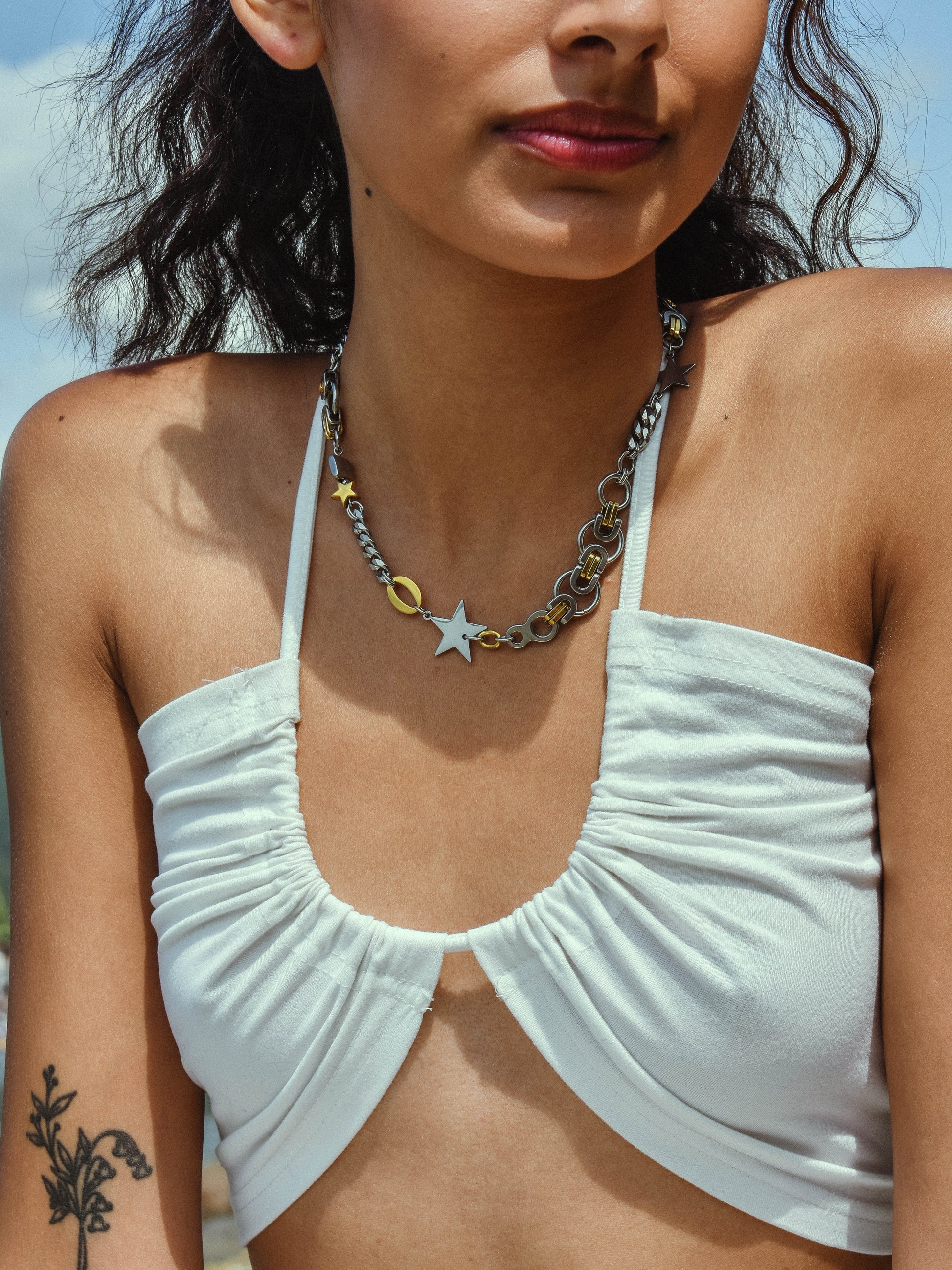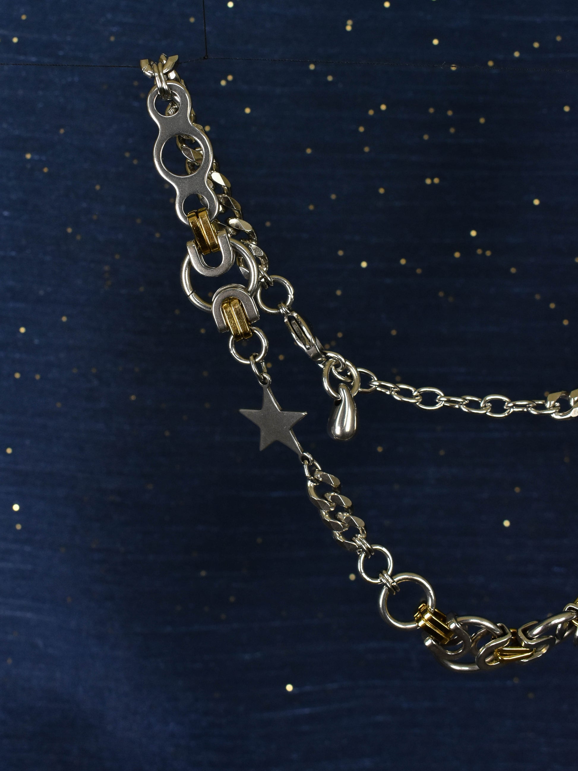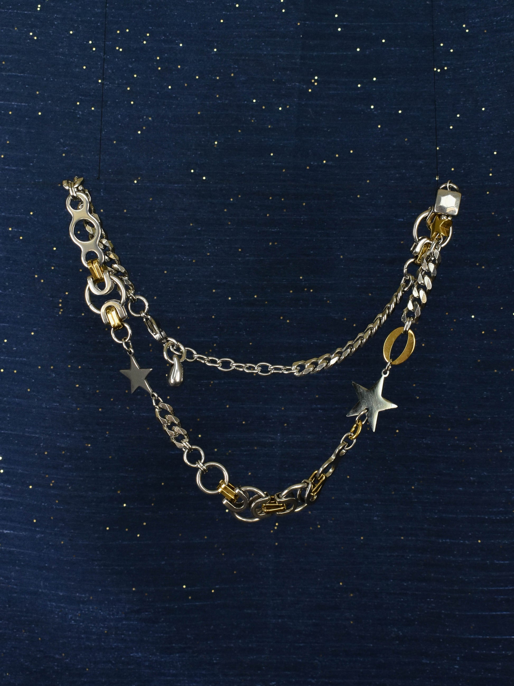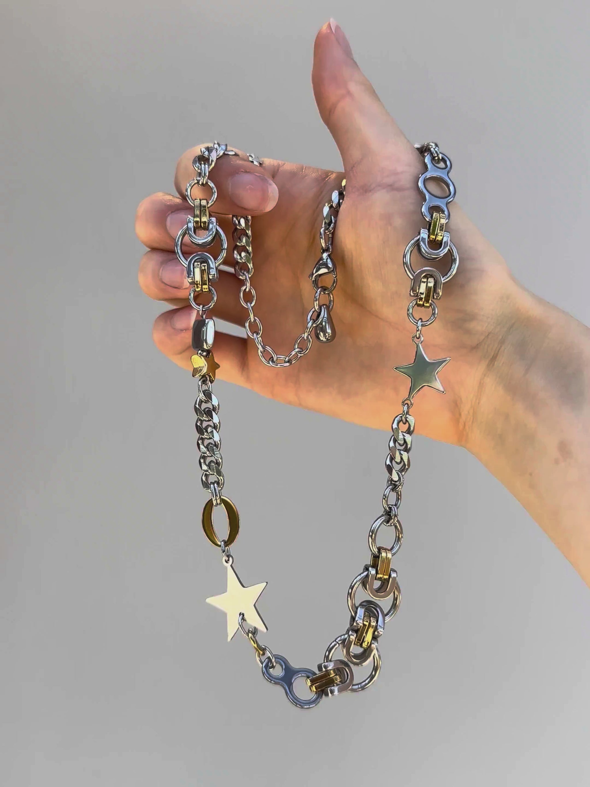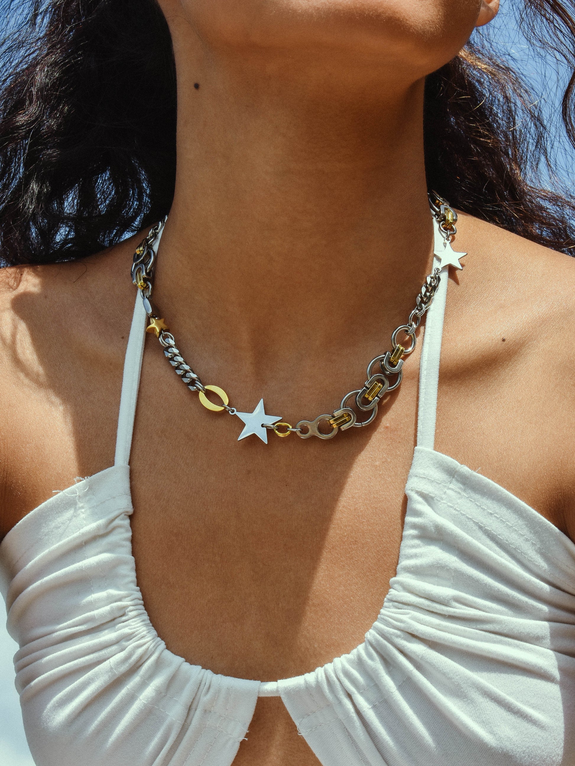 This chunky, silver and gold statement necklace features unique chain, charms and stars. It's different, edgy, and its androgynous nature makes it the perfect piece for masculine, feminine, or any looks in between.