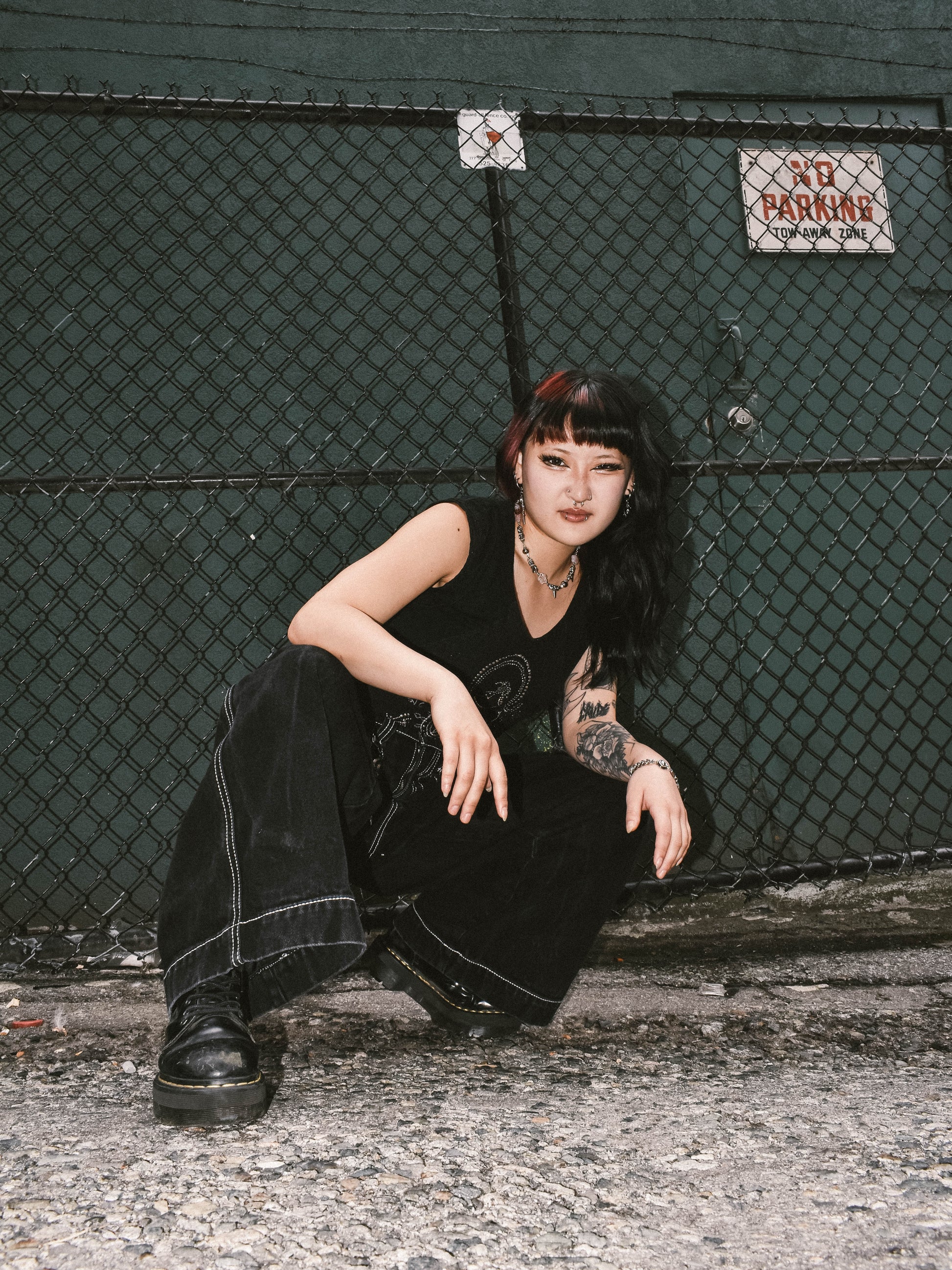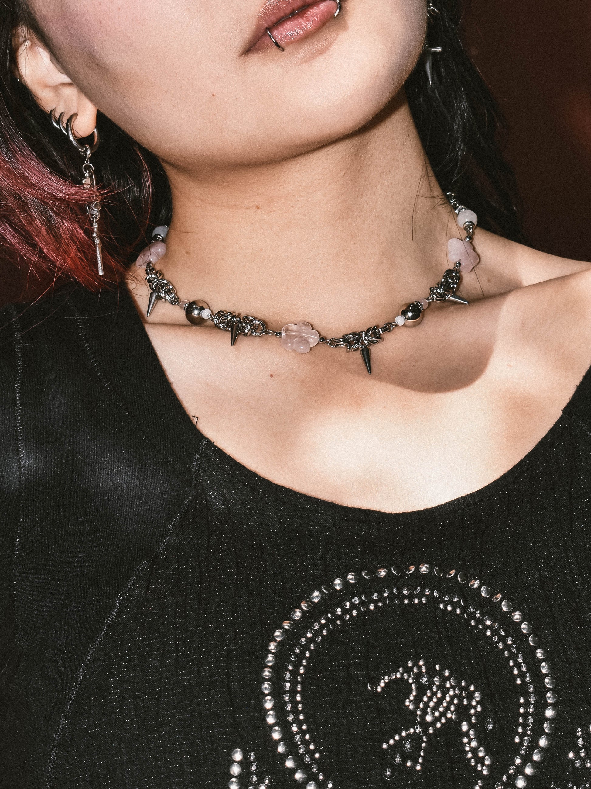 The Sakura Necklace features genuine flower-shaped rose quartz stones paired with chunky chainmaille and spikes. It is ethereal, grunge, androgynous, and truly one-of-a-kind,