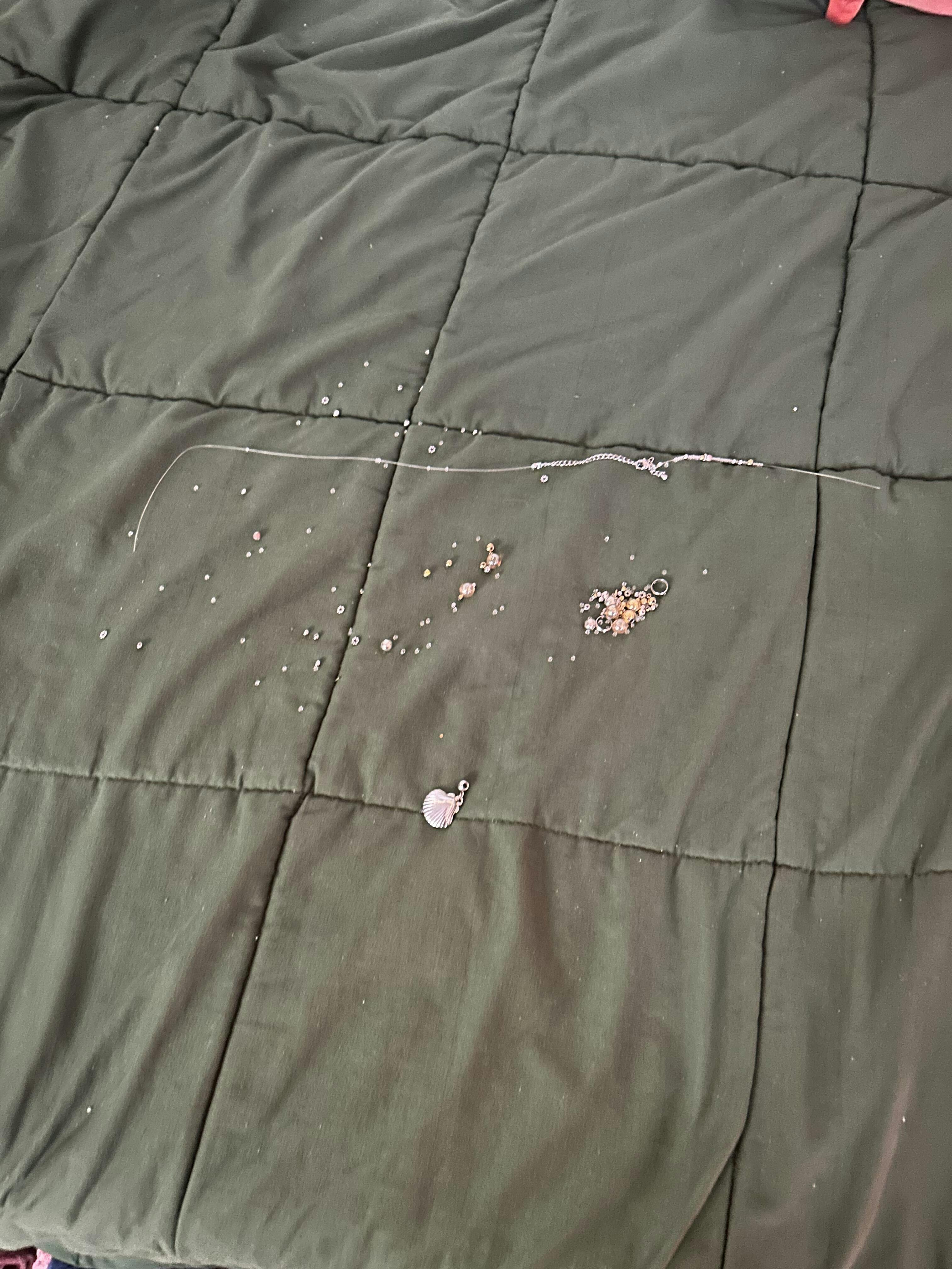 This oceanic necklace features a collection of silver and gold beads and a pretty shell charm in its center. The Seashell Necklace is whismical, ornate and unique.