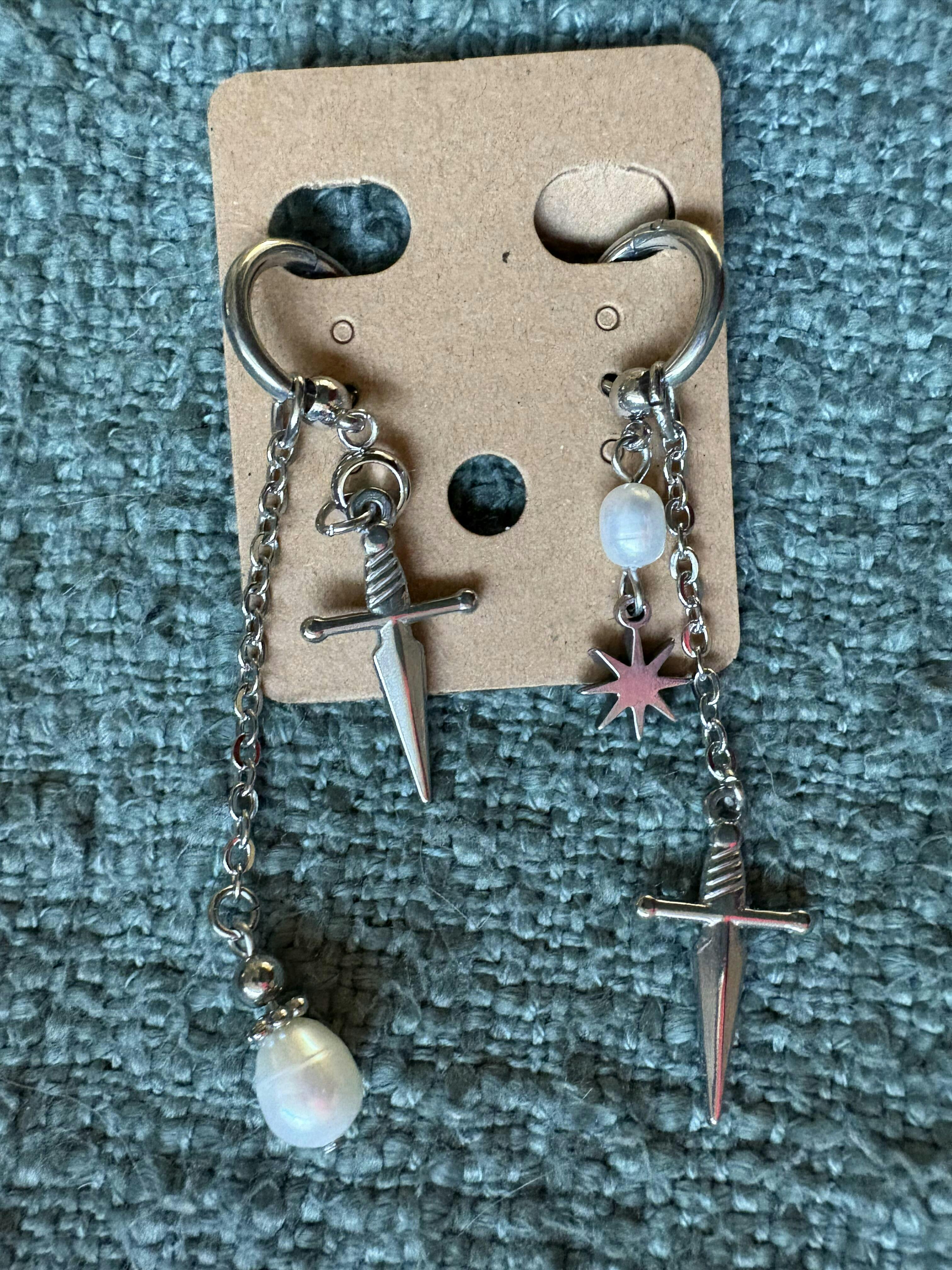 These ethereal earrings draw inspiration from Romeo and Juliet - in other words, star-crossed lovers. Featuring genuine fresh-water pearls and daggers, this mismatched pair is simultaneously grunge yet delicate.