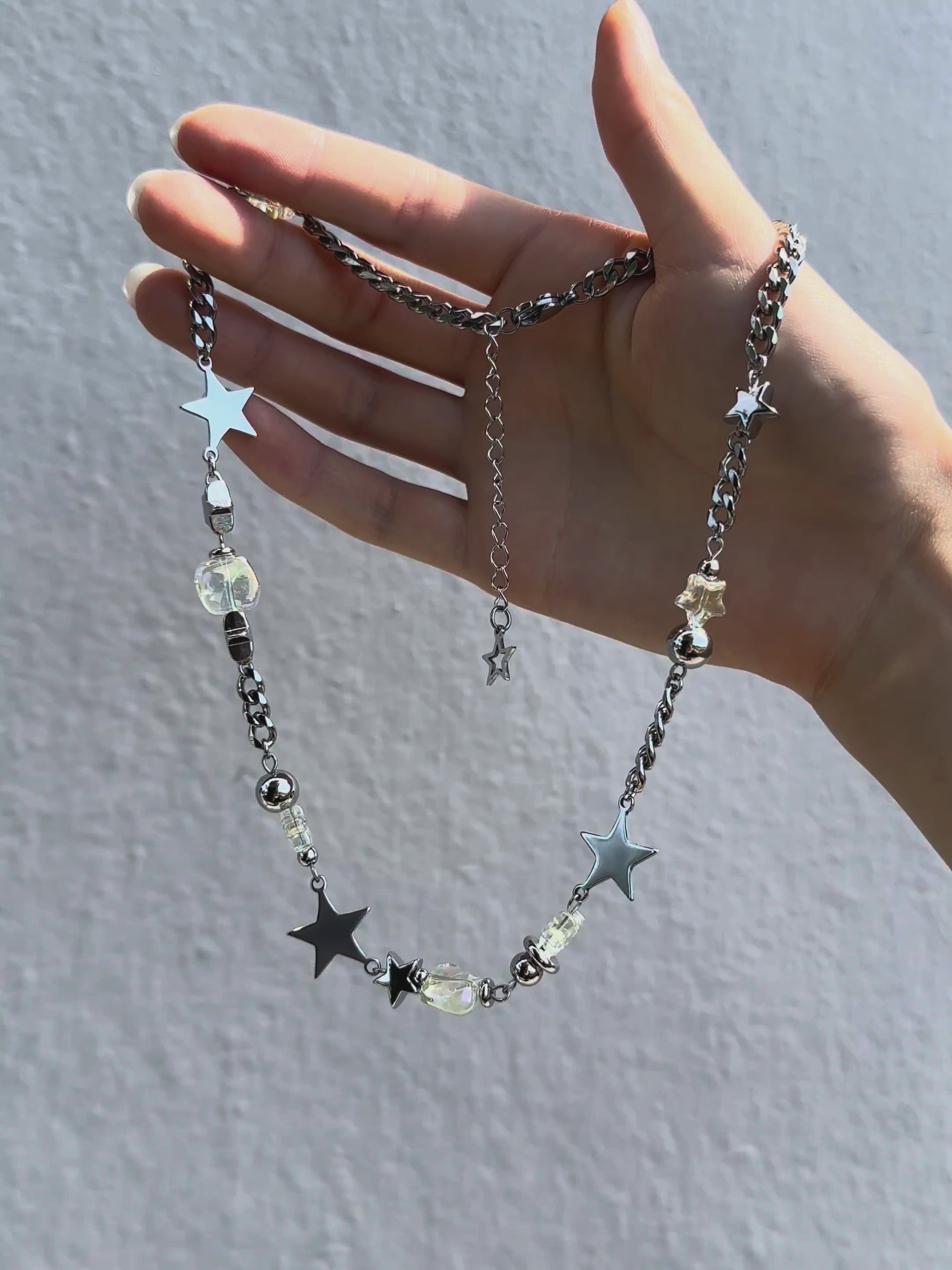 This star-studded necklace is a remixed version of it's predecessor, the Stargirl Necklace. Featuring iridescent glass beads and many, many stars, this grunge necklace is a great statement piece.