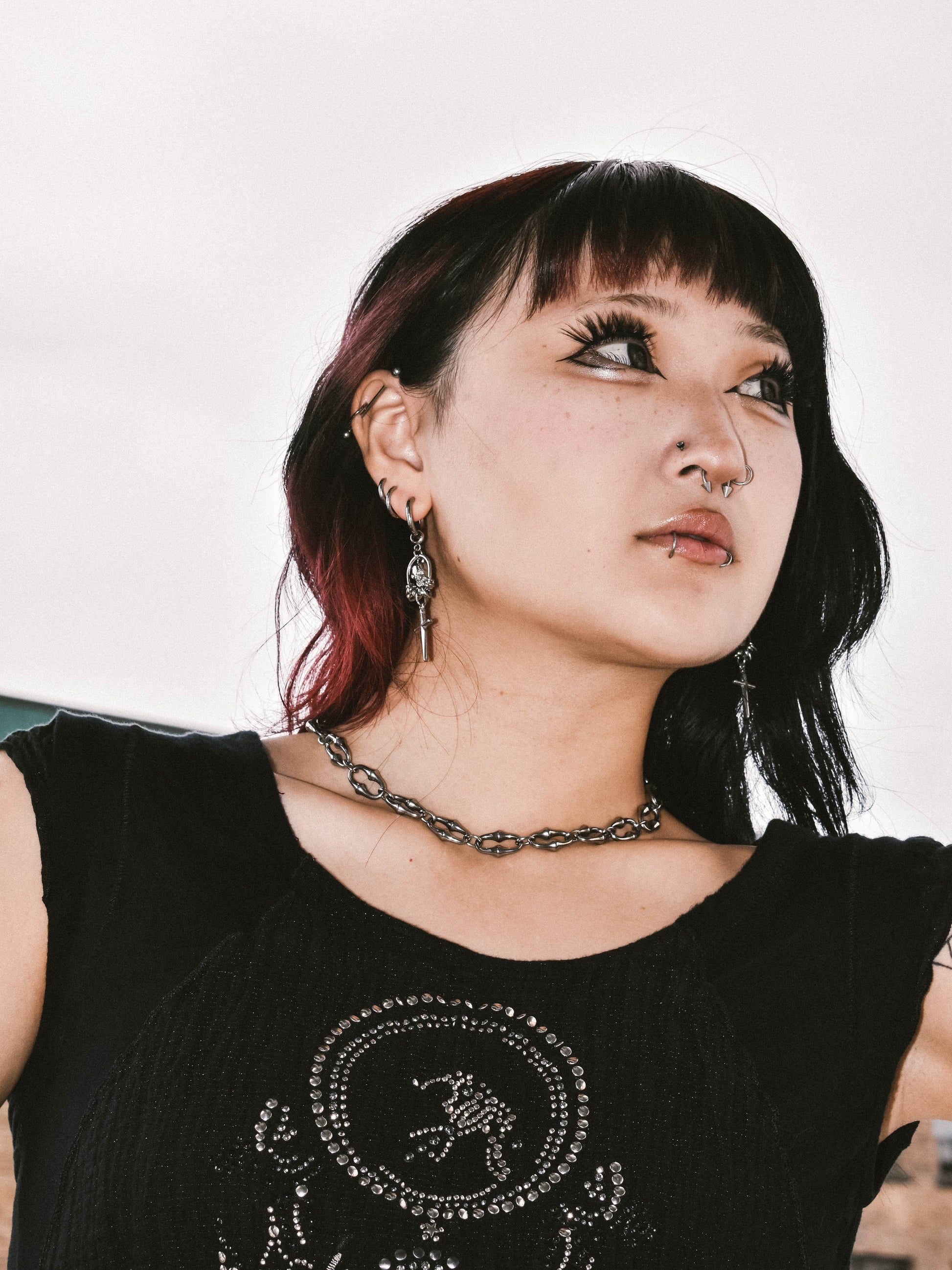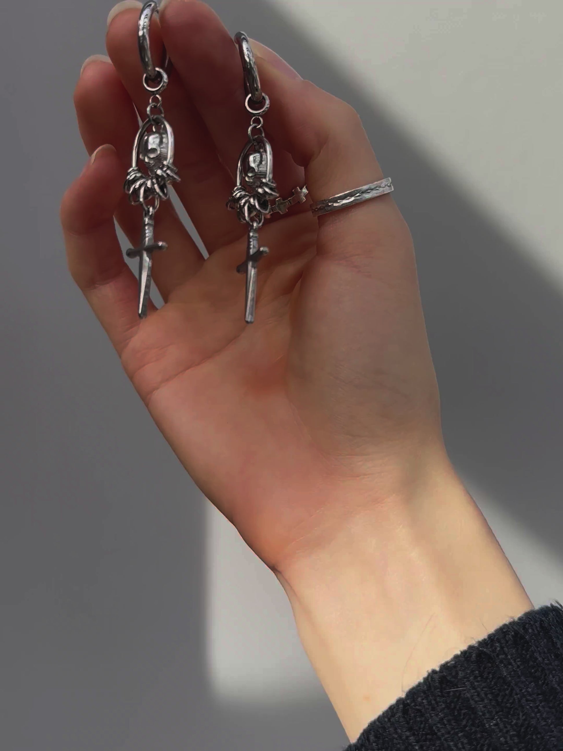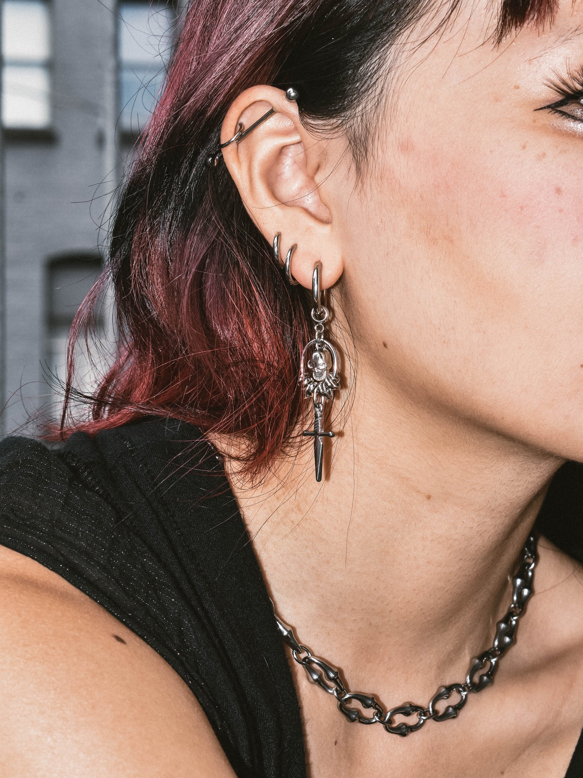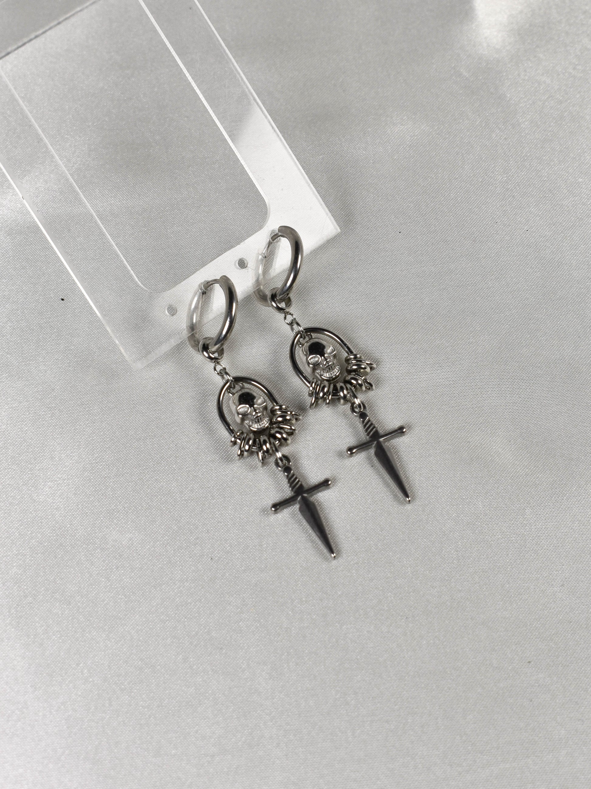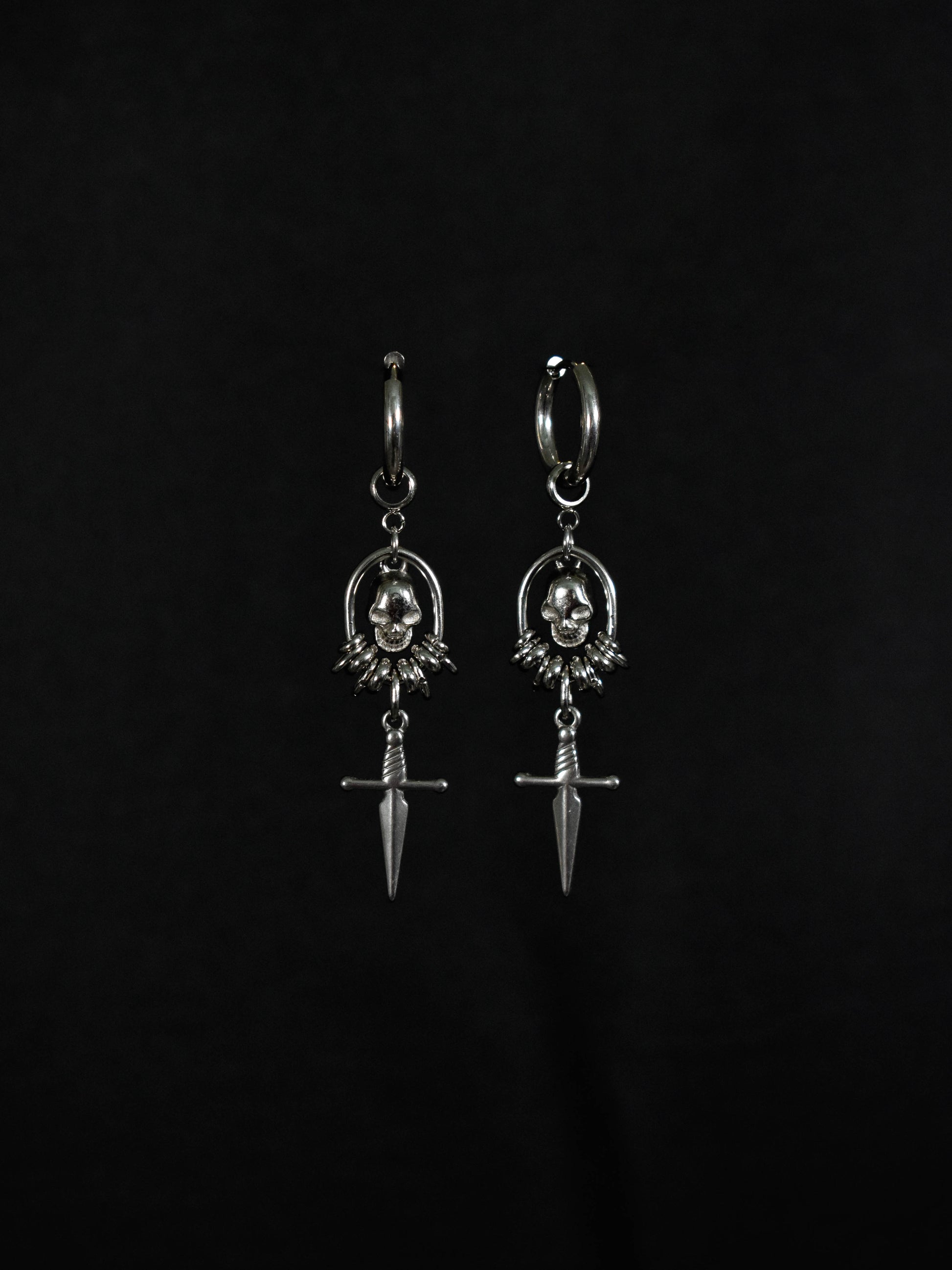 These punk-rock earrings feature little skulls and daggers suspended below. The Voodoo Earrings are gothic, grunge and androgynous.
